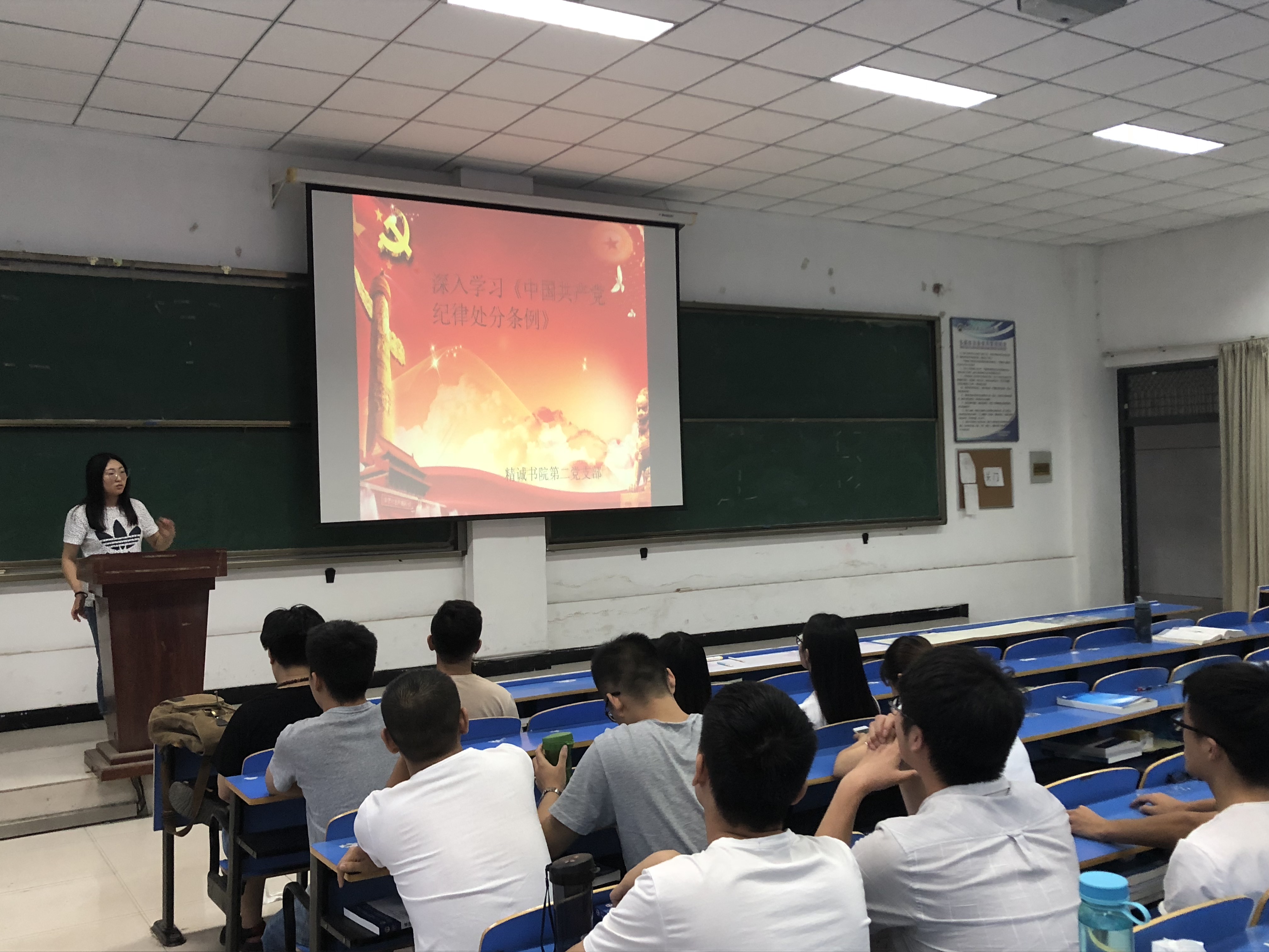 为加强党员党性教育学习,加强党员党性修养。9月10日,精诚书院第二党支部全体党员在党支部书记石中尼带领下于新乡校区502教室以深入学习《中国共产党纪律处分条约》为主题进行了本月的党课学习。