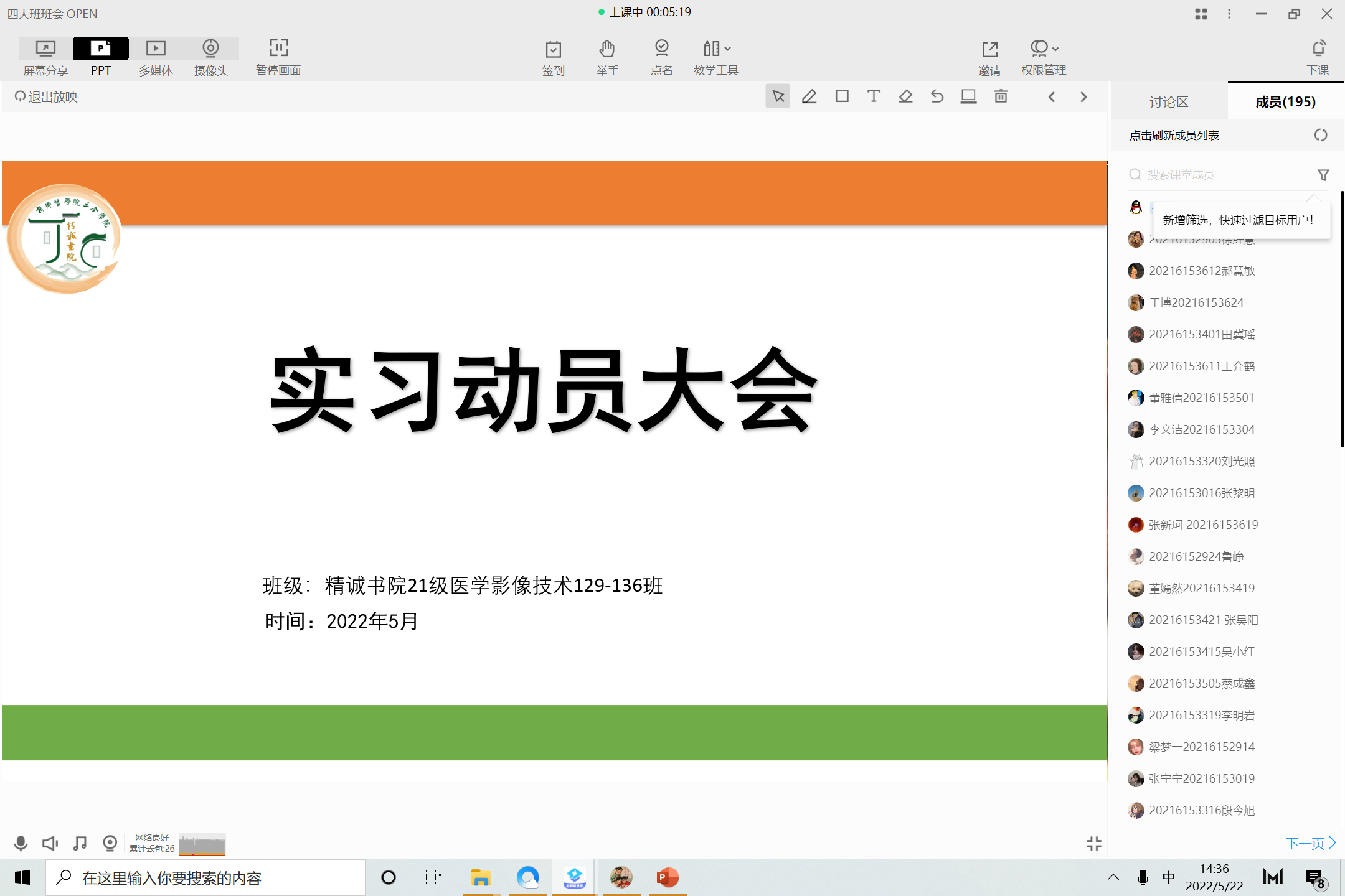 2021级医学影像技术129-136班辅导员秦磊,在线上班会中针对学校实习就业的工作流程及实习期的注意事项等方面进行了讲解,并耐心的为现场同学在“实习协议签订、实习时间”等多个问题进行一一解答。同时他指出实习是实现人才培养目标、提高学生综合能力的一个重要环节,希望同学们能够圆满的完成实习任务。