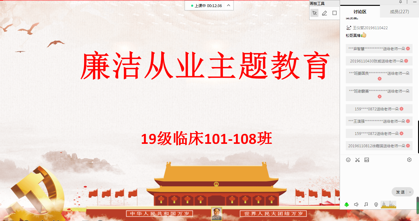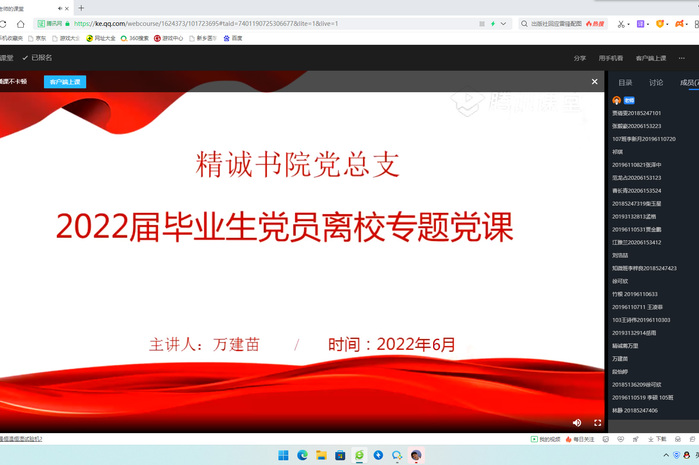 6月1日,精诚书院党总支副书记万建苗依托线上课堂代表书院党总支对毕业生即将踏上人生新征程致以诚挚的祝愿,并以“永葆党性初心,做新时代奋斗者”为主题为书院全体毕业生党员讲授离校前党课,促使毕业生党员提高党性修养,增强步入社会的责任感。万建苗还对毕业生党员们提出了几点期望:要坚定理想信念,筑牢思想根基;要练就过硬本领,扎实专业技能;要敬业爱岗,严于律己;要坚守底线,廉洁从业。希望大家永远保持一颗廉洁之心,严于律己,争做时代的先锋。”