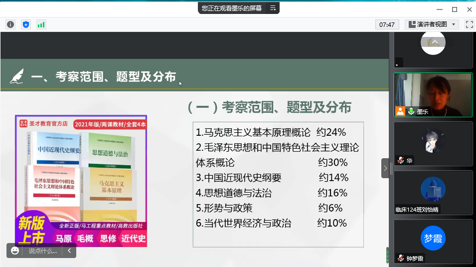 范艳香结合自身经历及教学经验,以“考研政治复习规划与策略”为主题,从考研新形势、考研新展望及建议、考研政治冲刺学习建议三个方面展开分析解读。她指出,每年考试教材都有所不同,同学们可以根据大纲解析(教育部考试中心、高等教育出版社)进行系统学习梳理,着重强调同学们需要特别注意书中标红的字体。同时她指出,如果同学们想要刷真题,范围优先选择近五年,时间过长可能会存在内容有所修改的问题。对于选择题刷题方面来讲,同学们至少应做1000道以上,并且对于做过的题,一定要弄清楚、搞明白,深入了解题目背后所考察的知识点。