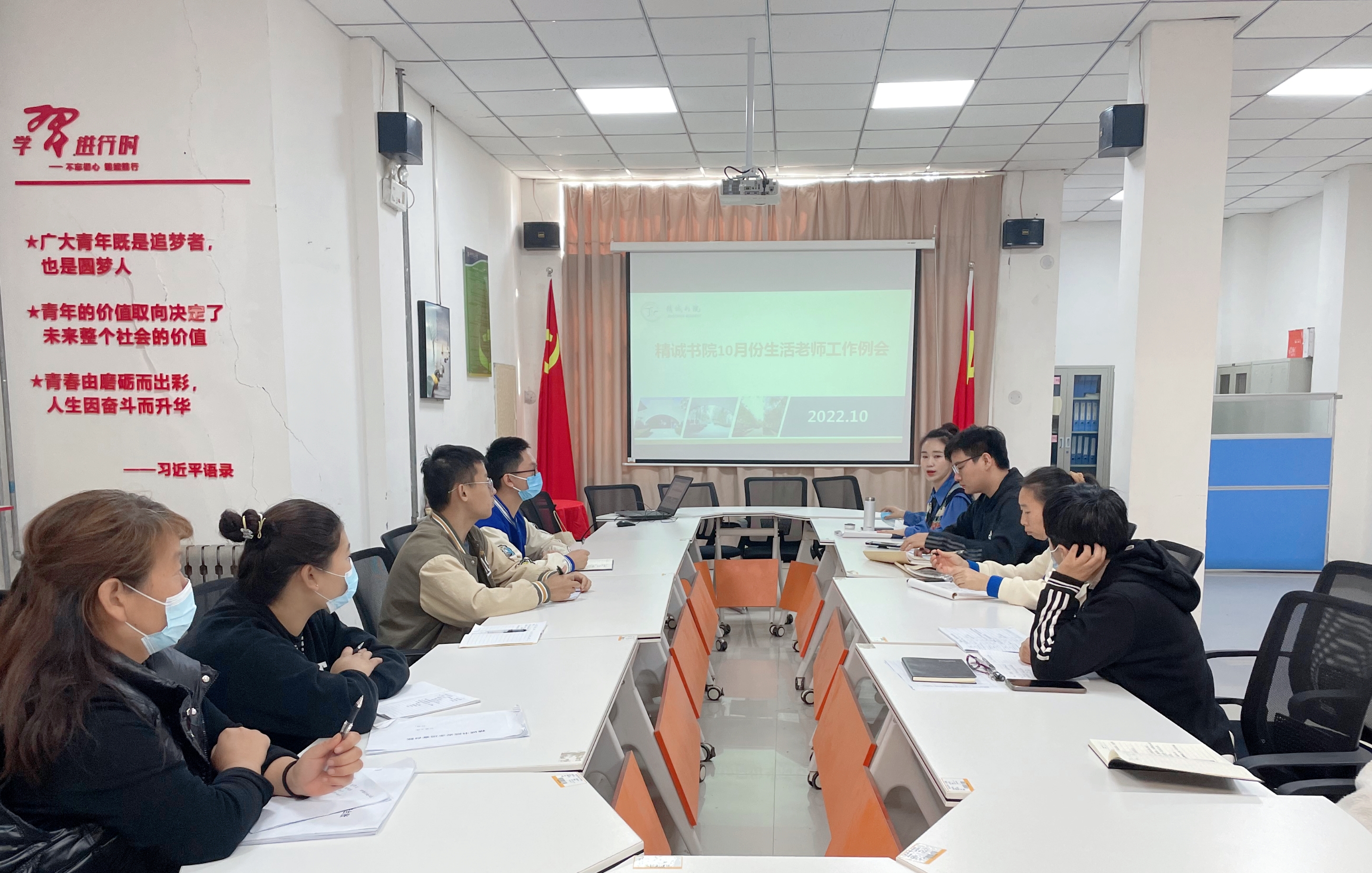 为规范学生宿舍管理,营造更加安全、卫生、舒适的生活环境。10月19日上午,精诚书院在党员活动室召开10月份生活老师例会。院务主任金潇、行政专员朱家乐、全体生活老师、宿管以及学生自管委员会负责人通过线上和线下的形式共同参加。