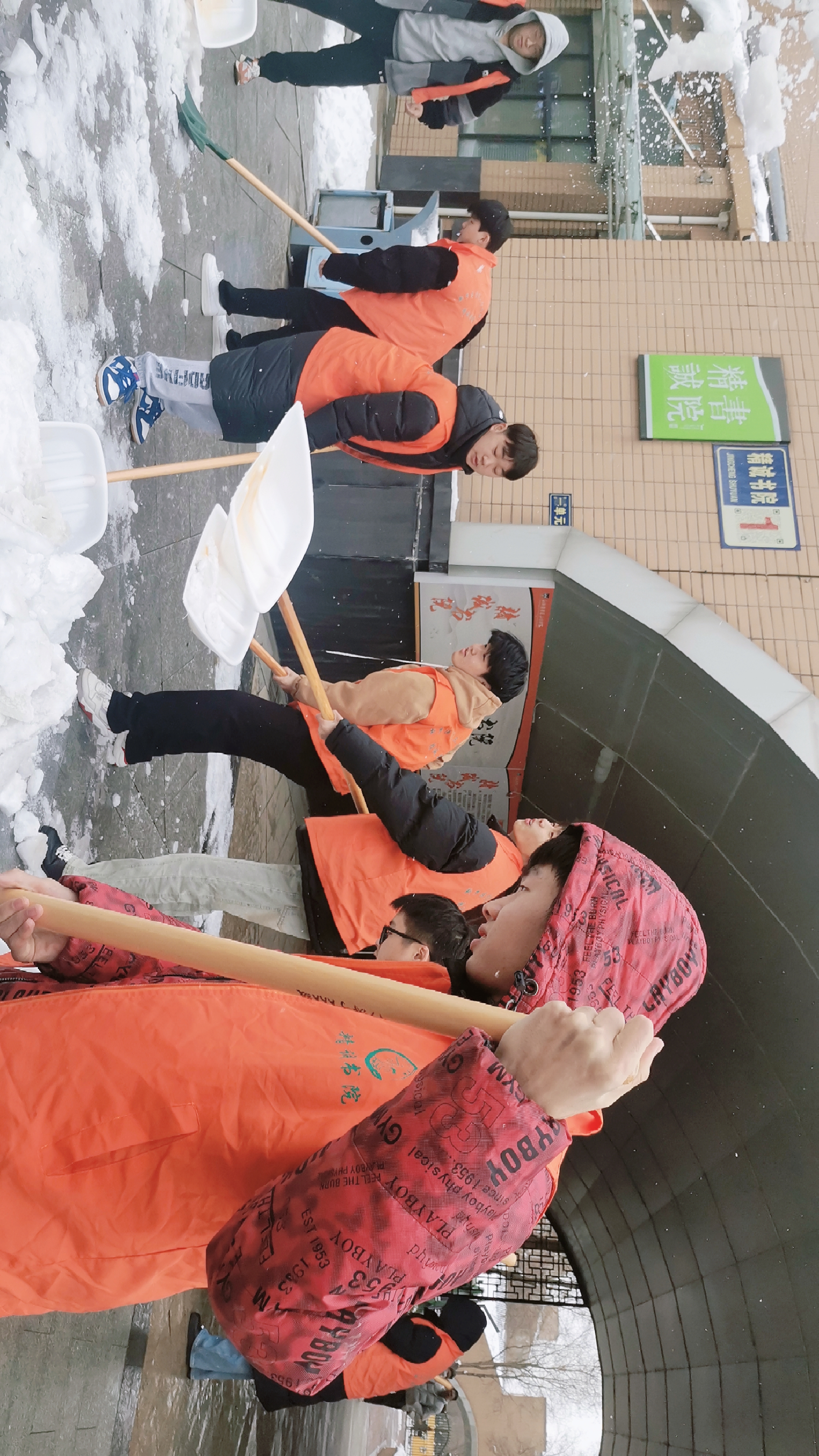 一夜北风紧,开门雪尚飘。12月11日清晨,学生党员组织所联系宿舍学生与书院教职工一起,对校园主干道的积雪进行了及时清扫,确保校园道路安全畅通。在此次活动中,学生党员们闻雪而动,充分发挥先锋模范带头作用,带领宿舍学生不畏严寒,团结合作,协调联动,在书院领导的带领下,挥动铁锹、扫帚等工具,对重点路段积雪进行除冰清扫,大家齐心协力,配合默契,热火朝天的劳动场面成为了冬日里一道亮丽的风景,经过近一个小时的奋战,校园主要道路恢复了正常通行,为师生出行带来了便利,树立了“一名党员、一面旗帜”的良好形象。
