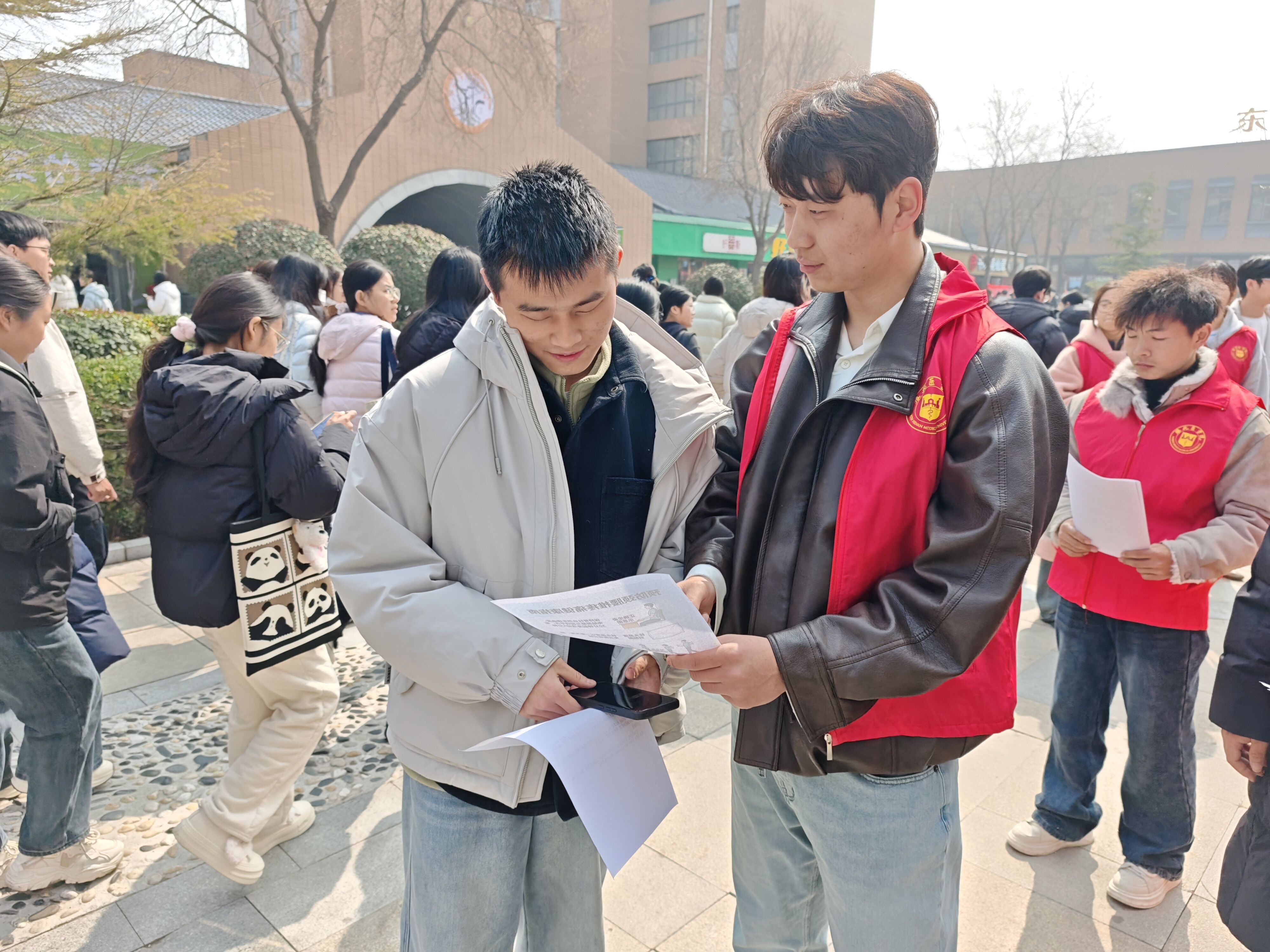 活动现场人头攒动,热闹非凡,志愿者们为过往的师生发放健康科普宣传单。宣传单内容丰富且实用,涵盖了肩颈劳损预防、日常肌肉放松技巧、办公室健康防护等多个方面,用通俗易懂的文字和生动形象的图示,为师生们普及健康知识。不少师生接过宣传单后,便驻足认真阅读,不时向志愿者询问相关问题,志愿者们都耐心细致地一一解答,现场互动频繁。