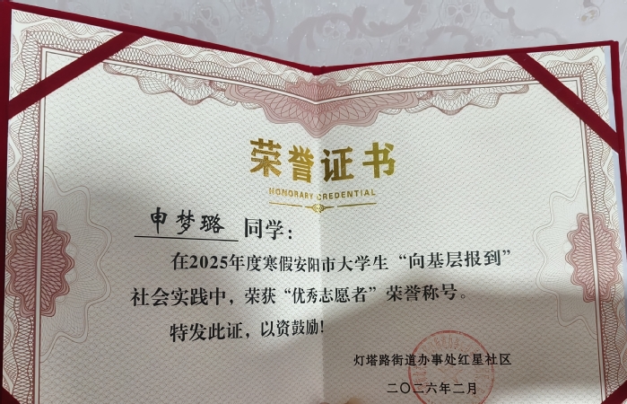 2025级护理学专业的申梦璐积极投身社区志愿服务。她穿梭于家乡社区,认真清扫公共区域,为居民打造整洁环境;走家串户开展居民意愿调查,倾听群众需求;还发挥特长参与视频剪辑,助力社区宣传,同时积极筹备文体活动,丰富居民生活。