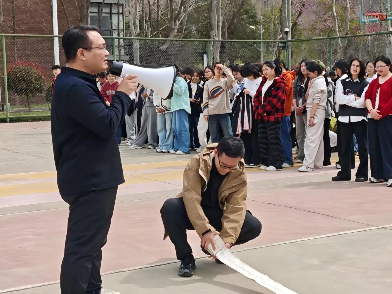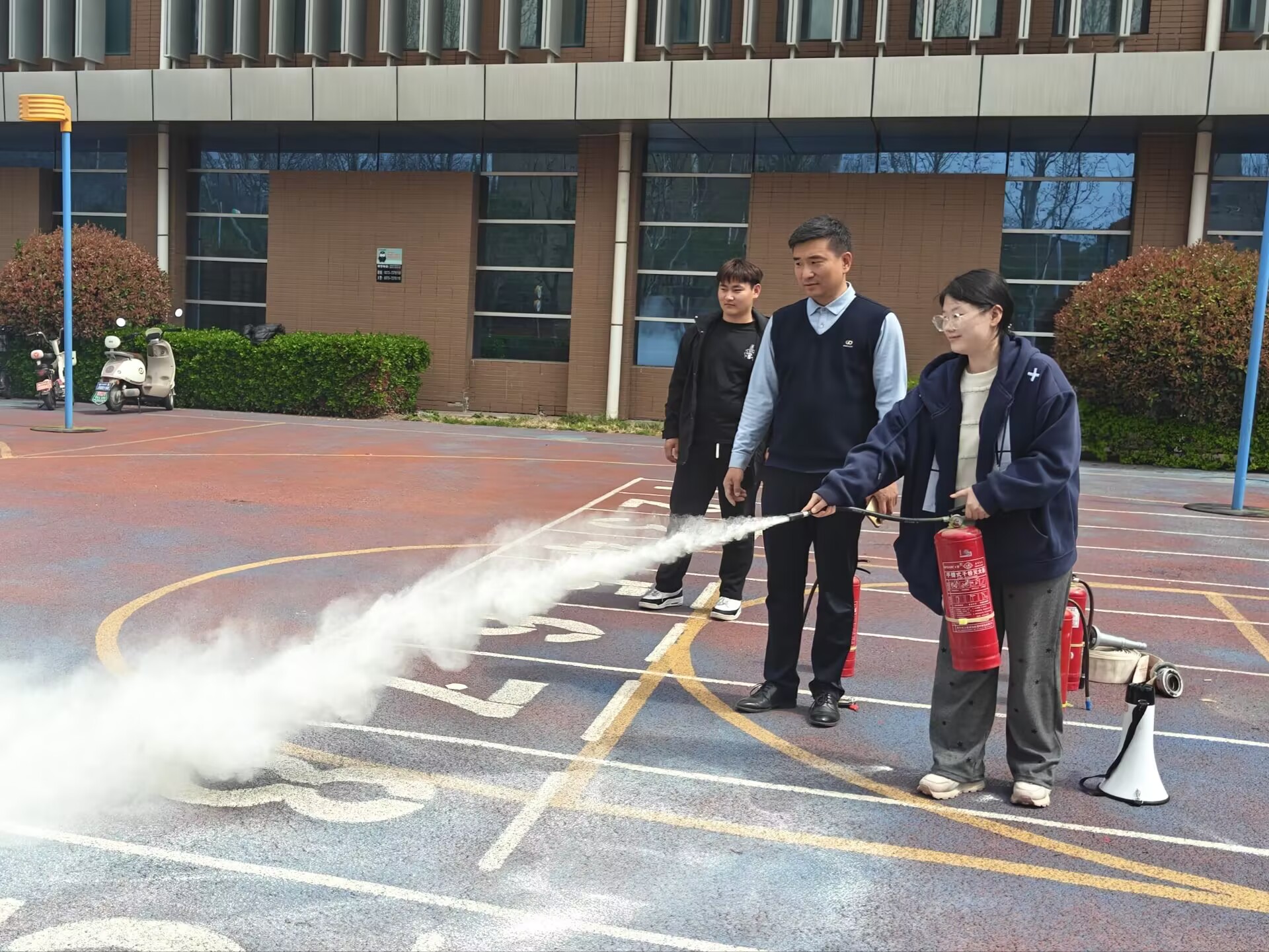 疏散演练结束后,河南省消防协会宣传教员李强结合校园火灾典型案例,尤其是宿舍火灾事故教训,通过案例剖析、现场讲解的方式,向师生详细普及了火灾的严重危害、日常预防措施、初起火灾扑救方法以及火场逃生自救技巧,重点强调了宿舍内禁用大功率电器、不私拉乱接电线、妥善存放易燃物品等宿舍防火关键要点,警示师生时刻绷紧消防安全之弦。在实操培训环节,李强教员现场演示了灭火器的正确使用方法,详解“提、拔、握、压”四字口诀的核心要领,指导同学们分组进行灭火实战操作。同学们踊跃参与、沉着操作,按照规范流程拿起灭火器,对准模拟火源根部精准喷射,成功扑灭模拟火情,切实将理论知识转化为实操能力。
