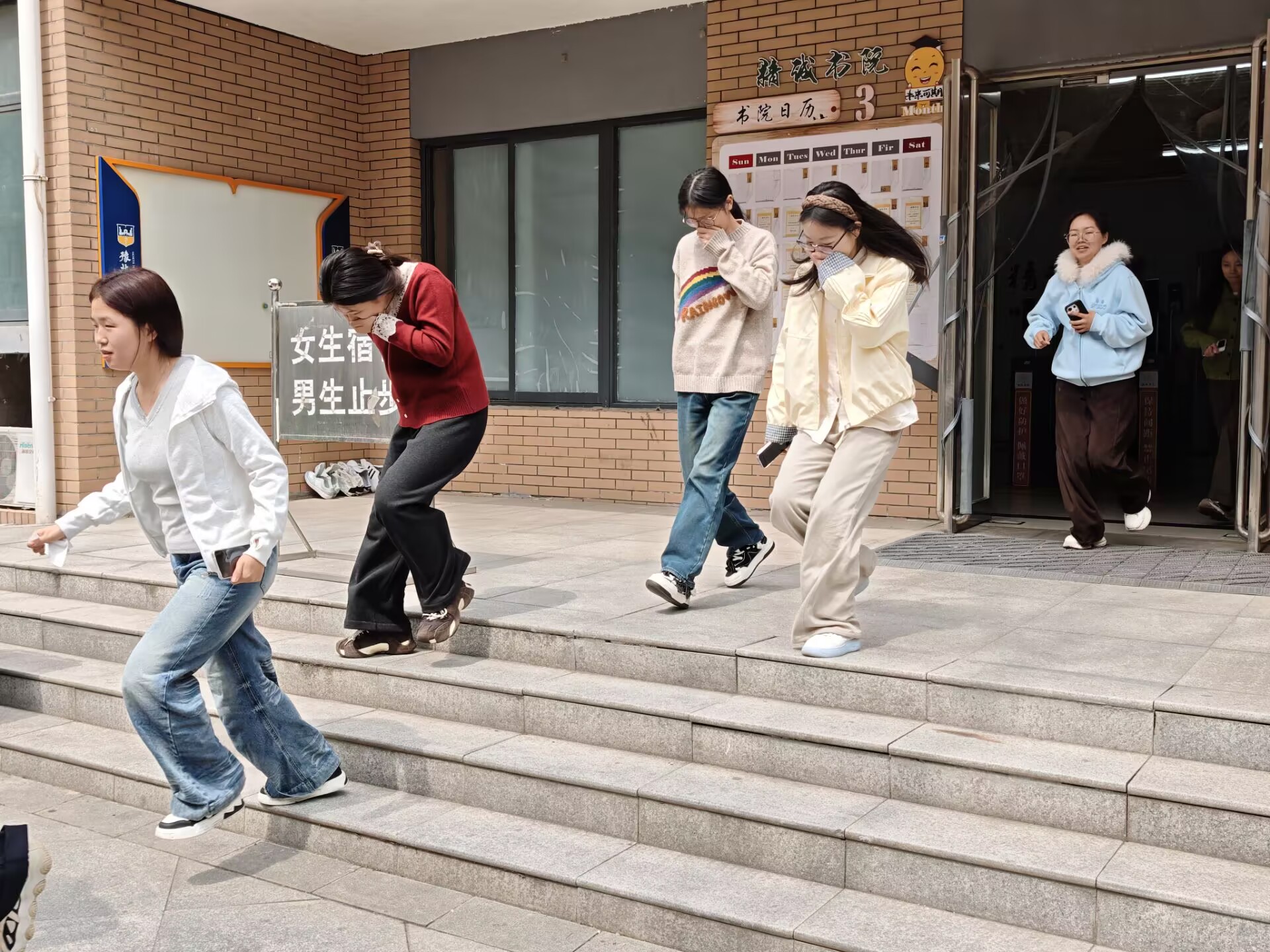 当日,演练在精诚书院A-08楼与高层公寓两个园区同步启动。随着党委副书记高明一声急促的演练哨声划破校园宁静,模拟火情突发,演练正式拉开帷幕。书院立即启动应急响应机制,全院师生闻令而动、迅速响应,严格按照预定疏散路线有序撤离。各疏散口、楼梯转角处的辅导员与志愿者提前就位、分工值守,耐心引导学生用湿毛巾捂住口鼻、弯腰低姿,沿着安全出口指示标识快速、有序撤离至指定安全集结点,全程做到不推挤、不慌乱、不逗留。到达集结点后,辅导员们迅速清点人数,逐级上报,确保无一人遗漏。整个疏散过程规范有序、衔接顺畅,未发生任何意外情况,圆满达成预期演练目标。2025级护理学刘梦璐感慨道:“这次演练特别贴近实战,让我深刻体会到消防安全无小事,不仅学会了正确的火场逃生和自救方法,更明白了‘防患于未然’的重要意义,收获满满。”