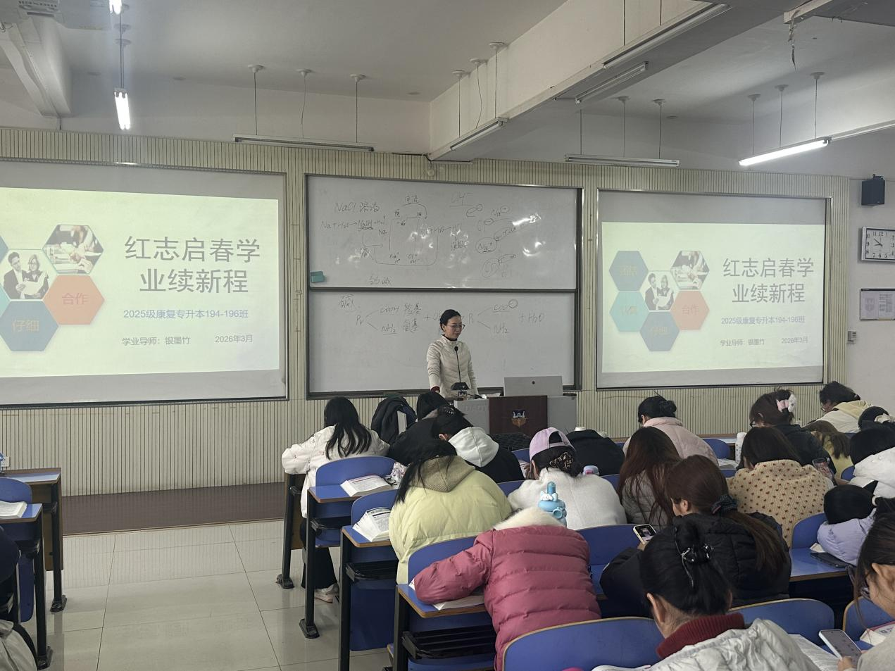 3月12日,康复医学院银墨竹老师在B203教室,为康复治疗学2025级194—196班学生开展“红志启春学业续新程”专题指导。银老师聚焦大三学生核心需求,围绕学分进度核查、升学备考规划、就业实习准备、考公/出国/创业等多元发展路径展开详细讲解,明确学业底线要求,提醒学生规避重发展轻学业、盲目跟风、拖延摆烂等常见误区,引导学生立足自身实际制定个性化发展计划,为顺利毕业与长远发展做好衔接。