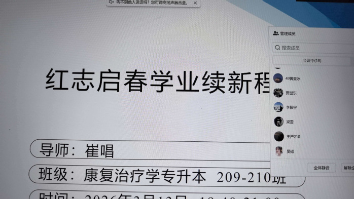 3月13日,康复学院崔唱老师通过腾讯会议线上平台,与2024级康复治疗学专升本209—210班学生开展“红志启春学业续新程”交流活动。崔老师组织学生分享考研资料、实习心得与毕业规划,针对实习与学习时间冲突、备考压力大等问题进行心理疏导,指导学生合理利用周末与碎片时间复习理论知识,为毕业考试与考研备考做好时间统筹,帮助学生坦然平衡实习与学业,明晰未来发展方向。