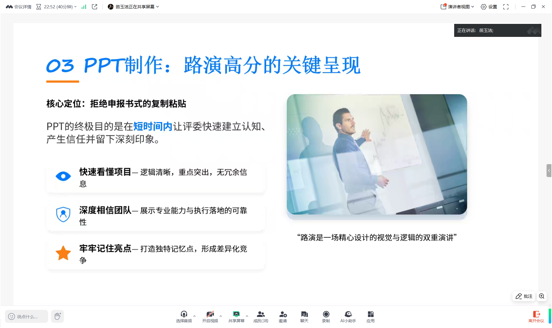 拥有丰富参赛经验的苗玉洁学姐聚焦“从0到1打造优质项目”,紧扣竞赛核心要求,指出项目应具备“能落地、有需求、可盈利”三大特质。她从调研痛点到项目命名,从申报书撰写逻辑到路演PPT制作技巧,全面展开拆解说明,提示申报书要数据说话、专业服人,PPT要视觉化、故事化,呼吁同学们步步扎实、知行合一。
